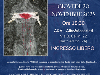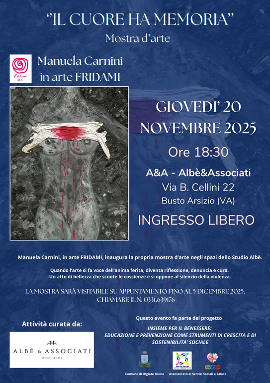 A&A - Albè & Associati Studio Legale inaugura nei propri spazi di via Cellini 22 a Busto Arsizio la mostra d’arte “Il cuore ha memoria” dell’artista lombarda Manuela Carnini, in arte Fridami, che sarà aperta al pubblico giovedì 20 novembre alle ore 18:30.