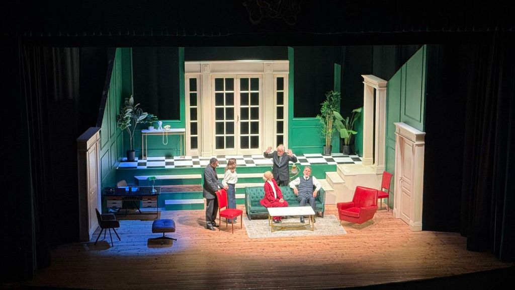 La scenografia, curata con minuzia, immerge il pubblico in un elegante interno borghese: salotto su due piani, divano verde, poltrone rosse, infissi bianchi, piante e un tavolino che diventa quasi testimone dei conflitti familiari.