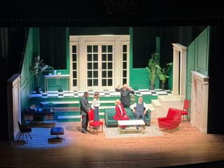 La scenografia, curata con minuzia, immerge il pubblico in un elegante interno borghese: salotto su due piani, divano verde, poltrone rosse, infissi bianchi, piante e un tavolino che diventa quasi testimone dei conflitti familiari.