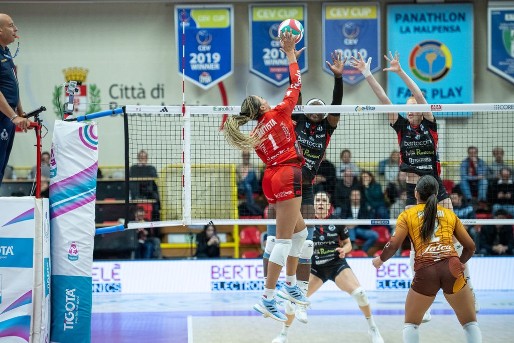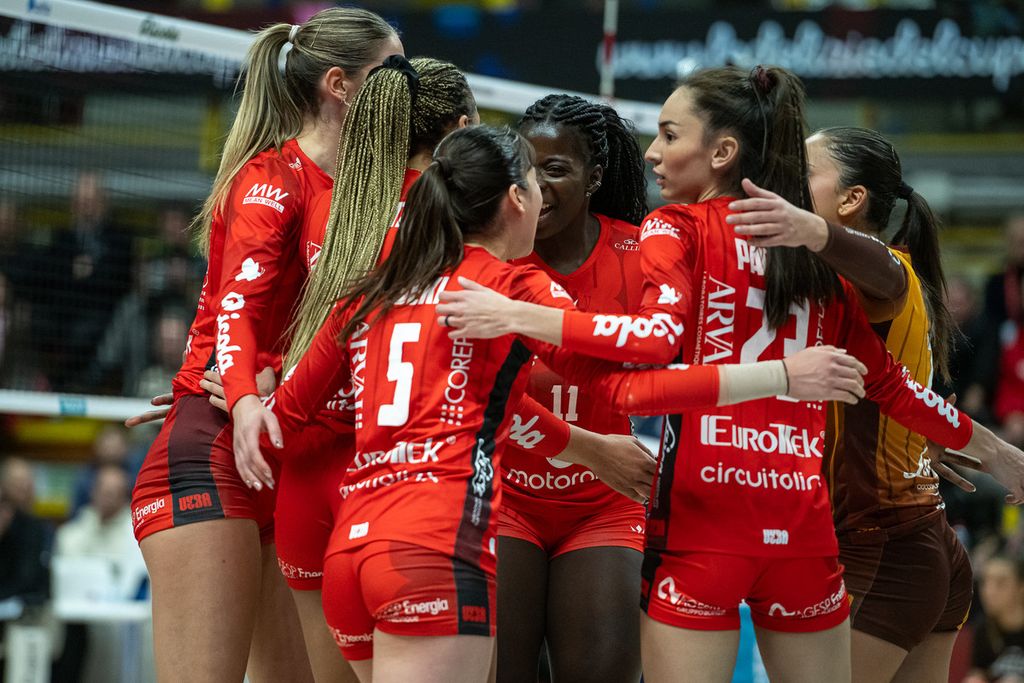 La Uyba gioca sciolta e si diverte, trascinando con sé il pubblico della e-work Arena. Il secondo set è un assolo: gran difesa corale e punto di Battista per l’8-5, poi murone di Torcolacci per il 9-5. Obossa firma il 14-10, Van Avermaet vince il duello a rete per il 17-11, e l’errore di Gardini spalanca la fuga definitiva (20-13). Parra continua a incantare: attacca il 23-15 e piazza l’ace del 24-15. Chiude l’errore di Williams: 25-15. Dominio totale. Ricezione di casa al 62% di positiva, 6 punti a testa, nel parziale, per Battista e Parra. 4 per Obossa e 3 per Van Avermaet.