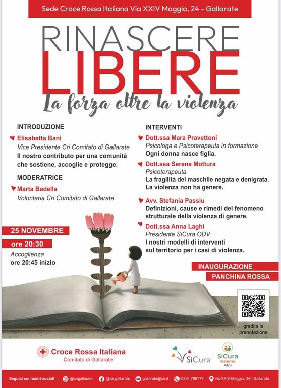 Domani sera, 25 novembre, alle 20.30, la sede della Croce Rossa Italiana di Gallarate, in via XXIV Maggio, ospiterà Rinascere libere, un appuntamento dedicato alla sensibilizzazione sulla violenza di genere, un fenomeno che continua ad attraversare la quotidianità con un’urgenza che non permette indifferenza. La serata sarà un momento di confronto profondo, pensato per riflettere non solo sull’emergenza, ma anche sul percorso di rinascita delle donne che trovano la forza di denunciare, ricostruendo passo dopo passo la propria vita.
