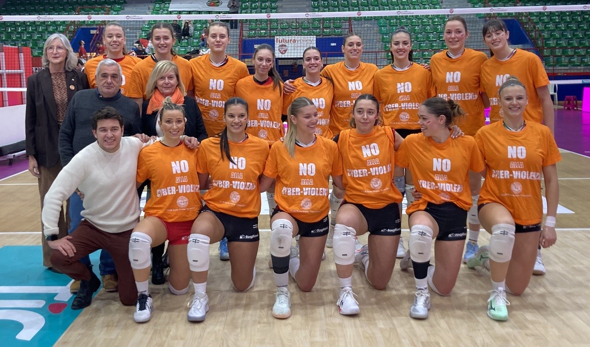 Prima del fischio d’inizio, le rappresentanti del Club Soroptimist Busto Arsizio Ticino Olona hanno consegnato alle atlete una maglia arancione con il messaggio “NO ALLA CYBER-VIOLENZA”, slogan che è stato reso visibile anche sulle locandine e sul maxischermo della Soevis Arena.