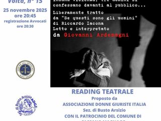Nel giorno simbolo dedicato alla lotta contro la violenza sulle donne, la sezione di Busto Arsizio di ADGI – Associazione Donne Giuriste Italiane propone a Villa Oliva una serata che unisce teatro, approfondimento e memoria civile. Il 25 novembre, alle 20.45, andrà in scena «La Confessione», un reading teatrale interpretato da Giovanni Ardemagni, che darà voce a pagine tratte da Se questi sono gli uomini di Riccardo Iacona. Un testo duro, diretto, necessario, che Ardemagni rilegge attraverso tre figure emblematiche, lasciando emergere le contraddizioni, le ombre e le responsabilità che spesso precedono l’atto violento. Un modo per guardare al fenomeno da una prospettiva meno battuta, invitando il pubblico a interrogarsi sulle radici culturali e sociali della violenza.