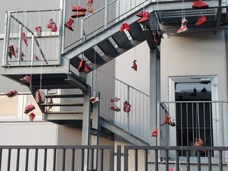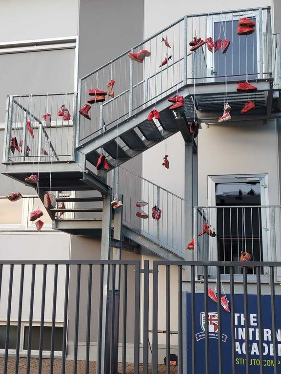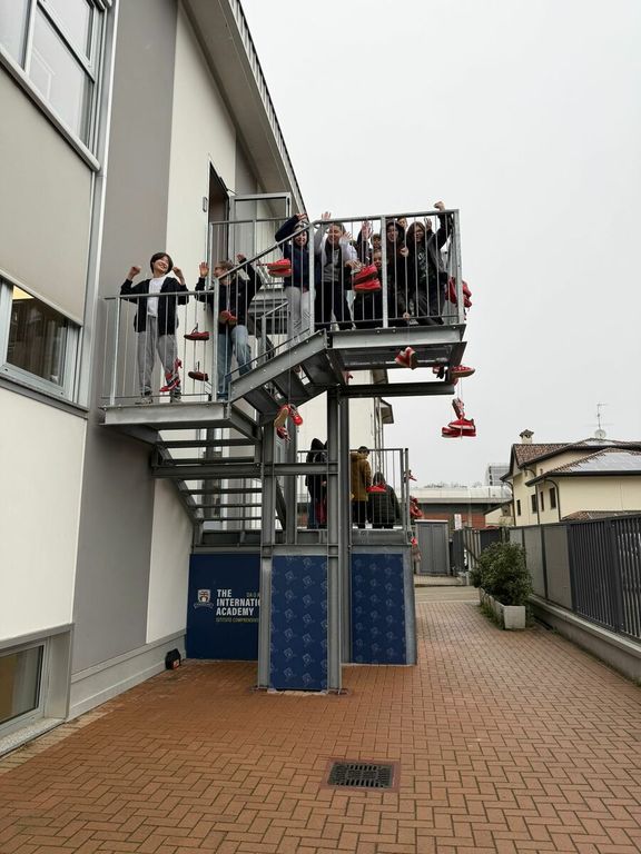 Una delle scalinate di The International Academy – la scuola bilingue che è un fiore all’occhiello di ACOF Olga Fiorini – è in questo momento puntellata da un gran numero di scarpe rosse, di vari modelli, e da una scritta che accompagna il messaggio contro la violenza di genere: “Non è amore se…”.