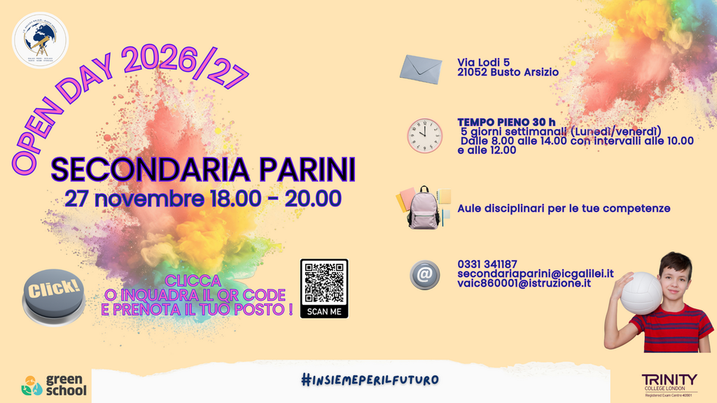 La ripartenza è immediata e passa attraverso gli appuntamenti già in calendario, che assumono ora un significato di rinascita. «Da domani ripartiamo, grazie ai docenti, i collaboratori e al Comitato genitori ricominciamo più forti di prima e proiettati verso il futuro, come dice il nostro slogan: “Insieme per il futuro” – conclude la referente –. Guardiamo al futuro con speranza: giovedì si terrà l’Open Day delle Parini dalle 18.00 alle 20.00, e venerdì quello delle Galilei, sempre con orario 18.00-20.00. Sarà un’occasione per riaffermare la bellezza della nostra comunità scolastica e la nostra volontà di ricostruire, insieme, un ambiente sicuro, accogliente e rispettoso».