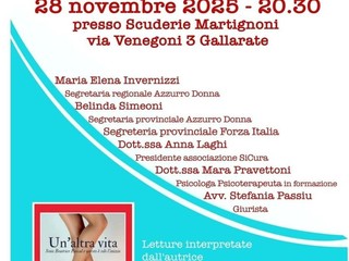 L’intervento si è concluso con uno sguardo al futuro e con l’annuncio della serata dedicata alla prevenzione e alla rinascita delle donne che hanno vissuto situazioni di violenza. L’iniziativa, intitolata “Rinascere Libere – La forza oltre la violenza”, si terrà venerdì 28 novembre alle 20.30 alle Scuderie Martignoni di via Venegoni 3. Interverranno la segretaria regionale di Azzurro Donna Maria Elena Invernizzi, la stessa Belinda Simeoni per la segreteria provinciale di Forza Italia, la presidente dell’associazione SiCura Anna Laghi, la psicologa psicoterapeuta in formazione Mara Pravettoni e l’avvocata Stefania Passiu.
