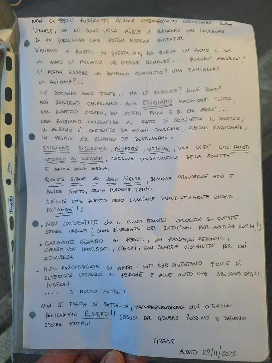 «Viviamo a Busto, in questa via, da un anno – si legge, oggi, sul foglio assicurato a un palo – e da un anno ci poniamo le stesse domande: quando avverrà? Ci potrà essere un bambino coinvolto? Una famiglia? Un animale? (…) Esigiamo maggiore tutela nel rispetto nostro, dei nostri figli e di chi verrà (…) Queste strade non sono sicure, bisogna prenderne atto e agire». Nel mirino degli anonimi autori, passaggi pedonali rischiosi e non rispettati, auto parcheggiate su entrambi i lati delle strade, in primis la velocità, eterno nemico della sicurezza, con limiti che l’esperienza comune dice essere sempre più ignorati.