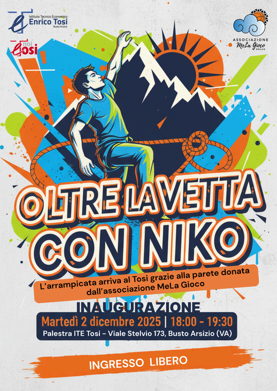 Martedì 2 dicembre, dalle 18 alle 19.30, l’Ite Tosi di Busto Arsizio inaugurerà ufficialmente la nuova parete di arrampicata all’interno dell’istituto, installazione donata dall’associazione MeLa Gioco. L’iniziativa, intitolata “Oltre la vetta con Niko”, sarà un momento di sport, crescita e condivisione aperto alla scuola e alla città.