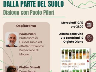 L’incontro si terrà mercoledì 10 dicembre, alle ore 21.00, presso “Albero della Vita”, in via Landriani 10, Olgiate Olona; al centro ci sarà il tema del consumo di suolo, partendo dalla ricchezza e dalla bellezza di questo sottilissimo strato del nostro pianeta, per arrivare a parlare di come questo venga costantemente maltrattato dall’uomo. L’incontro con il professor Pileri sarà interessante anche per fornire ai cittadini spunti di riflessione ed esempi concreti di come sia possibile avere una visione del suolo diversa e metterla in pratica.