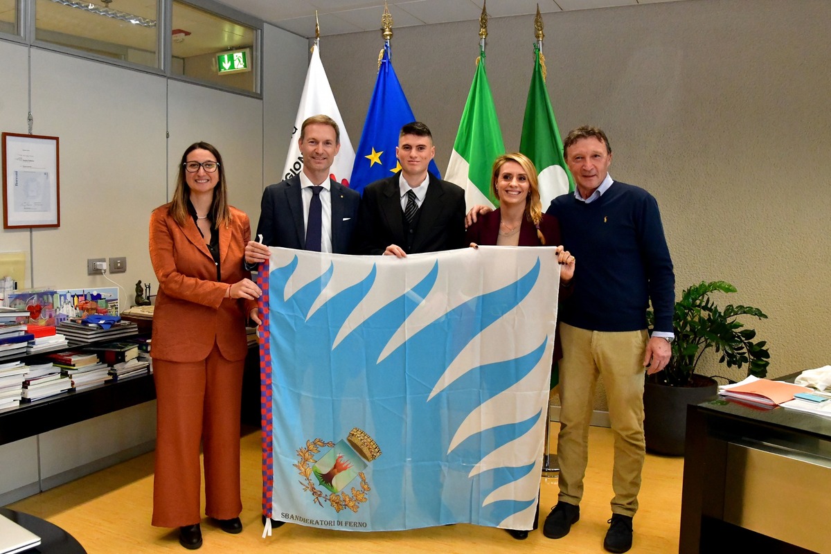 Il consigliere Dell’Erba, insieme al presidente del Consiglio regionale Federico Romani, hanno ricevuto e premiato Valerio Masiero, ragazzo autistico di 22 anni, da dieci attivo nell’A.s.d. Sbandieratori di Ferno.