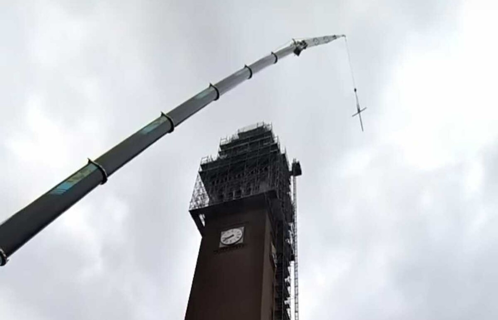 L'operazione tecnica si è trasformata, per qualche decina di minuti, in un evento visivo di rara suggestione. Agganciata ai cavi di una gru colossale, estesa per oltre 130 metri, la struttura d'acciaio benedetto la scorsa settimana (LEGGI QUI) ha spiccato il volo. Un’ascesa lenta, quasi solenne, che ha visto il simbolo sacro staccarsi da terra per diventare via via più piccolo agli occhi di chi osservava dal basso, fino a quasi confondersi con il grigio delle nubi.