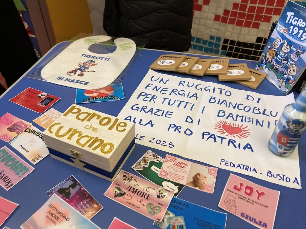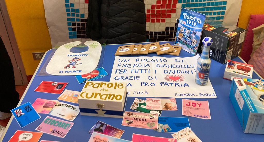 Non sono mancati, poi, momenti particolarmente emozionanti, come la presenza tra i piccoli ricoverati della pronipote del commendatore Giovanni Toia, bustocco doc e vicepresidente della Pro Patria ai tempi gloriosi della Serie A. Alla bambina è stata donata la mitica maglia biancoblù a strisce orizzontali. Un aneddoto tenero e divertente, arricchito dalla telefonata fatta subito dalla mamma al papà per farsi dire che ruolo avesse il bisnonno della bambina in Pro Patria, oltre che per condividere l’emozione del momento. Un frammento di storia che ha saputo rendere la mattinata ancora più speciale.