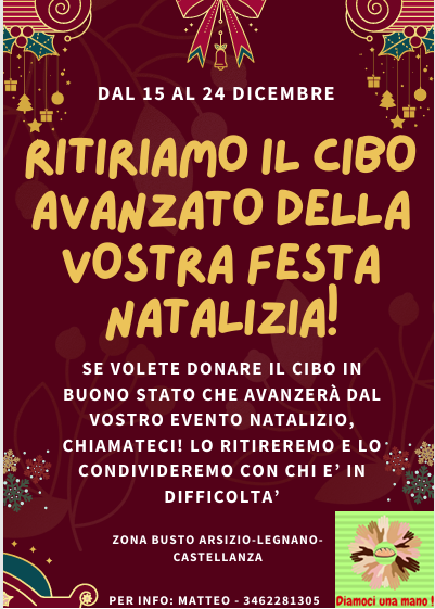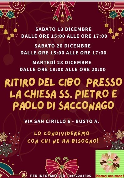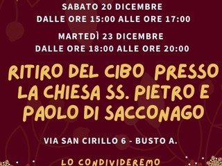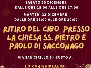 Anche quest’anno è possibile contribuire portando alimenti e condividendo idealmente un posto a tavola con chi è in difficoltà. I ritiri si terranno alla chiesa dei Santi Pietro e Paolo, in via San Cirillo 6 a Busto Arsizio (Sacconago), nelle seguenti date: 13 dicembre, dalle 15:00 alle 17:00 - cibo a lunga conservazione (pasta, scatolame, latte a lunga conservazione, olio, dolci); 20 dicembre, dalle 15:00 alle 17:00 - cibo a lunga conservazione; 23 dicembre, dalle 18:00 alle 20:00 - cibo a lunga conservazione e cibo già cucinato, per garantirne la corretta conservazione.