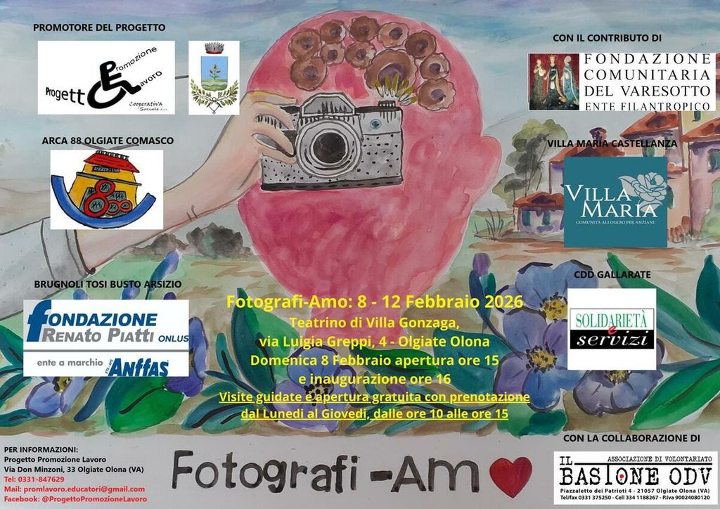 Domenica 8 febbraio 2026, alle ore 16, al Teatrino di Villa Gonzaga di Olgiate Olona, sarà inaugurata la mostra Fotografi-Amo, il nuovo progetto della Cooperativa Progetto Promozione Lavoro, realizzato con il contributo della Fondazione Comunitaria del Varesotto (Bando 2024/06 - Interventi Sociali) e il patrocinio del Comune di Olgiate Olona. L’apertura al pubblico inizierà alle ore 15, con visite guidate gratuite prenotabili dal lunedì al giovedì, dalle 10 alle 15.