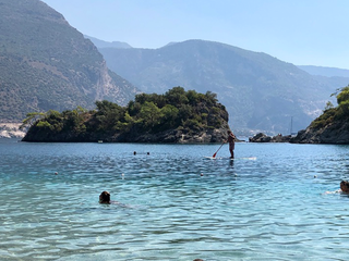 Ölüdeniz si trova sulla costa sud-occidentale della Turchia, lungo un tratto del Mare Egeo che alterna natura protetta e turismo massiccio. La sua identità sta nella convivenza degli opposti. Da una parte la Blue Lagoon, area protetta e a ingresso contingentato, celebre per le sue acque trasparenti. Dall’altra la spiaggia della costa, costruita attorno alle esigenze del viaggiatore. Due estetiche, due ritmi, due idee di accoglienza. Nessuna prevale. La mattina, vicino alla laguna, tutto sembra magico. La vegetazione costiera delimita l’area del parco nazionale e Il colore del mare ha un effetto ottico romantico: sedimenti chiari, fondale basso e flora marina, che restituiscono luce invece di assorbirla. I gesti sono lenti: una tavola da paddle surf che avanza, bambini che raccolgono pietre piatte, barche lontane dalla riva come sospese. L’atmosfera è misurata e la gente parla poco. Alcuni osservano l’arco naturale che chiude la baia, come se quel paesaggio fosse un allineamento cosmico.