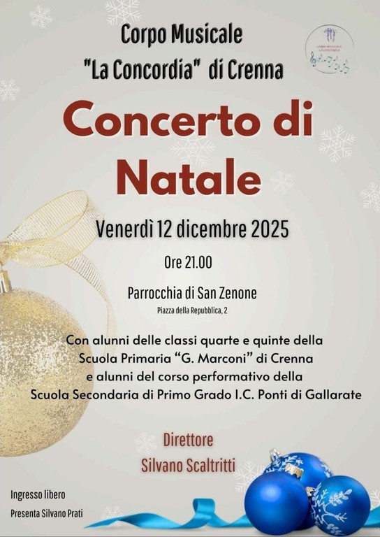 La sera precedente, giovedì 12 dicembre, la Chiesa di San Zenone a Crenna ospiterà il Concerto di Natale del Corpo Musicale La Concordia, ensemble storico della frazione gallaratese, diretto dal Maestro Silvano Scaltritti.