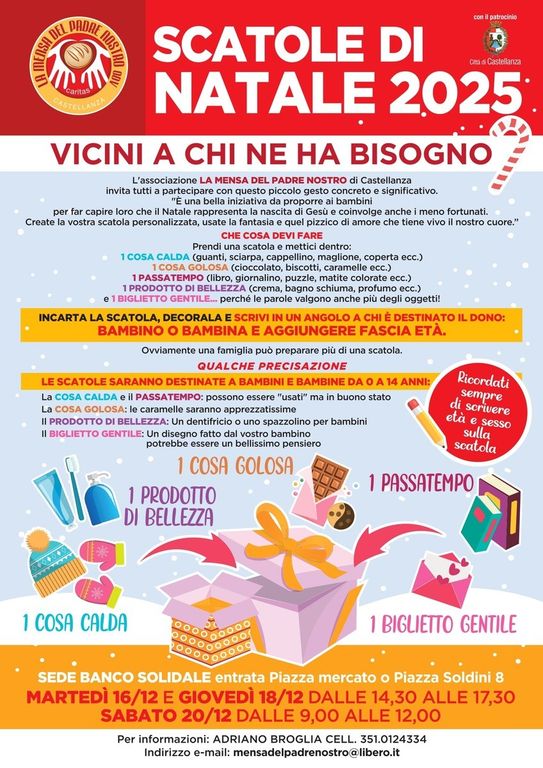 Torna anche quest’anno l’iniziativa “Scatole di Natale”, promossa dall’associazione La Mensa del Padre Nostro con il patrocinio del Comune di Castellanza, che nella scorsa edizione ha registrato la raccolta record di 324 scatole regalo, oltre a numerosi libri, giocattoli, peluche e indumenti. Un risultato che testimonia la crescente attenzione delle scuole del territorio e delle famiglie, con richieste di partecipazione arrivate anche dai comuni limitrofi.