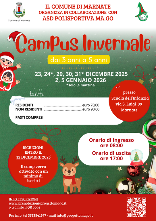 Anche quest’anno l’amministrazione di Marnate ha deciso di riproporre il Campus Invernale, per garantire ai ragazzi un luogo sicuro e stimolante dove poter trascorrere le vacanze natalizie mentre i loro genitori sono al lavoro.