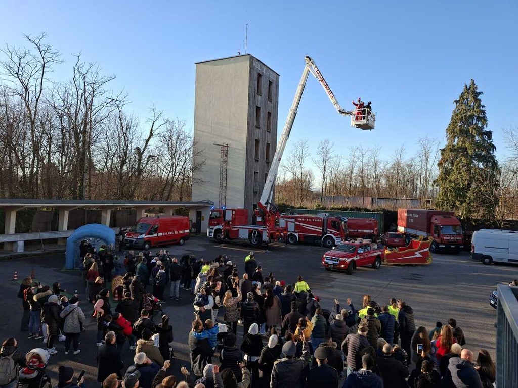Festa doveva essere e festa è stata, al distaccamento dei Vigili del Fuoco di corso Sempione (foto in fondo). Il copione dell’evento giunto alla 38esima edizione (la presentazione QUI) non ha risparmiato grandi classici e colpi di scena: la distribuzione di caramelle e panettoni, il grande ritorno dell’elicottero che ha sorvolato l’area, l’accademia dei mini pompieri per i più piccoli, l’esposizione di mezzi storici e un intervento fino ai 25 metri del castello per recuperare Babbo Natale, circondato da fumo rosso. Ma l’appuntamento di oggi pomeriggio ha dispensato anche emozioni che vanno molto al di là dello scambio di auguri, del gioco, della solidarietà classica.