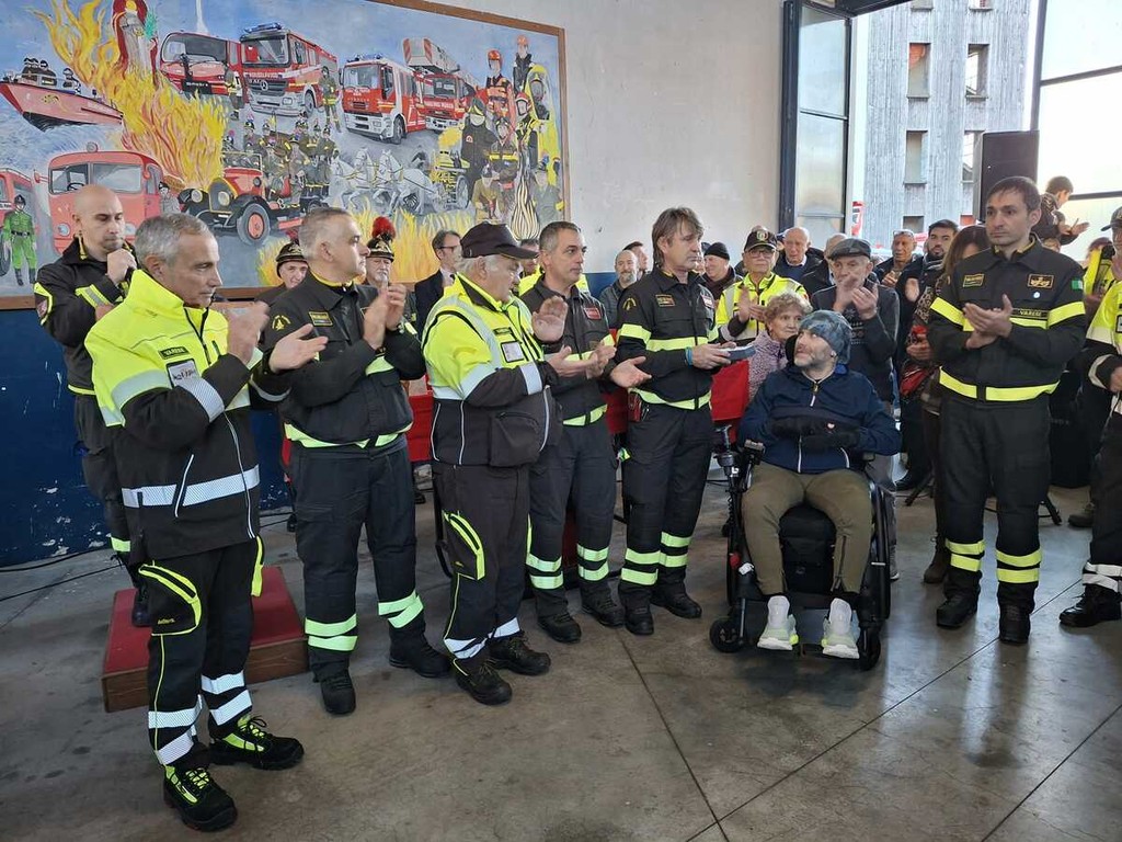 Quando la giornalista Chiara Milani (da oggi vigile del fuoco ad honorem, su disposizione del Ministero dell’Interno) ha chiamato le famiglie di Roberto Di Saverio e Alessio Teoldi, due pompieri scomparsi prematuramente, per ricevere un contributo economico, significativo innanzitutto perché segno di vicinanza e affetto, il livello emotivo della manifestazione si è impennato. E ha continuato a salire alla consegna di una borsa di studio alla piccola Chiara Teoldi, figlia di Alessio, otto anni e buoni voti, un po’ frastornata ma determinata ad andare fino in fondo, ad affrontare la prova della folla e dei riflettori. Apice toccato con l’arrivo Devid Ricci, anch’egli destinatario di un contributo economico, 7mila euro raccolti con la festa che i pompieri hanno organizzato a Cassano Magnago, in giugno, per aiutarlo ad affrontare cambiamenti di vita radicali. Devid, costretto su una sedia a rotelle da un infortunio occorso in servizio, a Como, ha ricevuto il riconoscimento con gli occhi lucidi. Ha sussurrato poche parole, sentite solo dai Vigili del fuoco che gli si sono fatti incontro, quasi a circondarlo con un abbraccio di divise, corale.