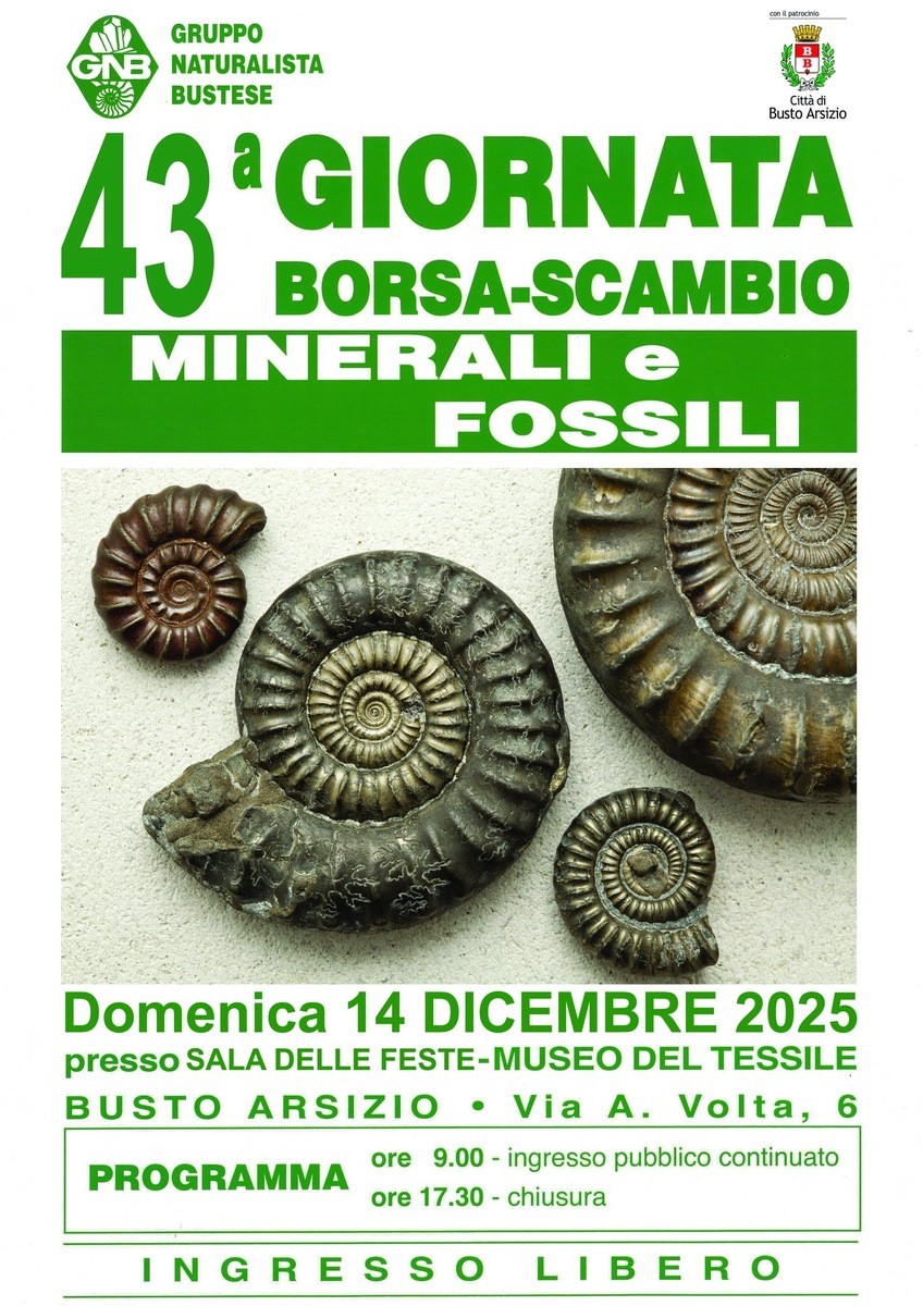 Arriva la 43° Giornata Borsa Scambio Minerali e Fossili nella Sala delle Feste del Museo del Tessile, via Volta n.° 6 a Busto Arsizio. In pista come sempre il Gruppo Naturalista Bustese. Dalle 9 alle 17.30 un viaggio tra le meraviglie della terra.