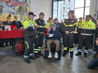 Quando la giornalista Chiara Milani (da oggi vigile del fuoco benemerito, su disposizione del Ministero dell’Interno) ha chiamato le famiglie di Roberto Di Saverio e Alessio Teoldi, due pompieri scomparsi prematuramente, per ricevere un contributo economico, significativo innanzitutto perché segno di vicinanza e affetto, il livello emotivo della manifestazione si è impennato. E ha continuato a salire alla consegna di una borsa di studio alla piccola Chiara Teoldi, figlia di Alessio, otto anni e buoni voti, un po’ frastornata ma determinata ad andare fino in fondo, ad affrontare la prova della folla e dei riflettori. Apice toccato con l’arrivo Devid Ricci, anch’egli destinatario di un contributo economico, 7mila euro raccolti con la festa che i pompieri hanno organizzato a Cassano Magnago, in giugno, per aiutarlo ad affrontare cambiamenti di vita radicali. Devid, costretto su una sedia a rotelle da un infortunio occorso in servizio, a Como, ha ricevuto il riconoscimento con gli occhi lucidi. Ha sussurrato poche parole, sentite solo dai Vigili del fuoco che gli si sono fatti incontro, quasi a circondarlo con un abbraccio di divise, corale.