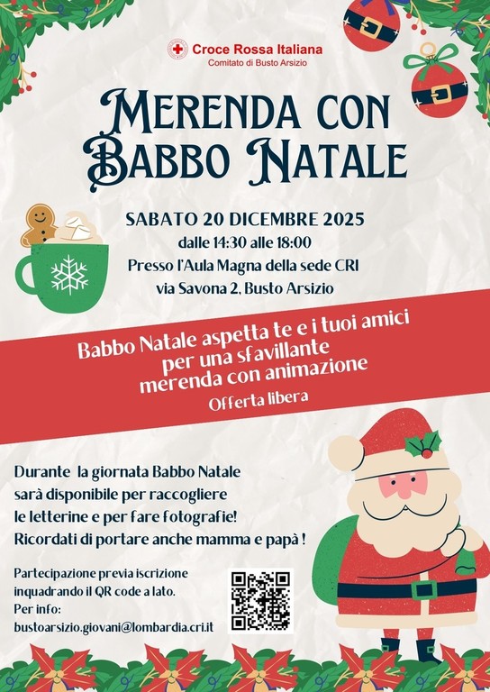 Prenotazione graditissima (QR Code della locandina in fondo, per info: bustoarsizio.giovani@lombardia.cri.it). «Non mandiamo via nessuno – la precisazione – ma segnalare il proprio arrivo ci aiuta dal punto di vista organizzativo. Qualcuno ci ha chiesto se avremmo riproposto la merenda fin dallo scorso agosto, vista l'attesa ci piacerebbe gestire le cose al meglio. Anche aspetti come la presenza di bambini che hanno allergie o intolleranze».