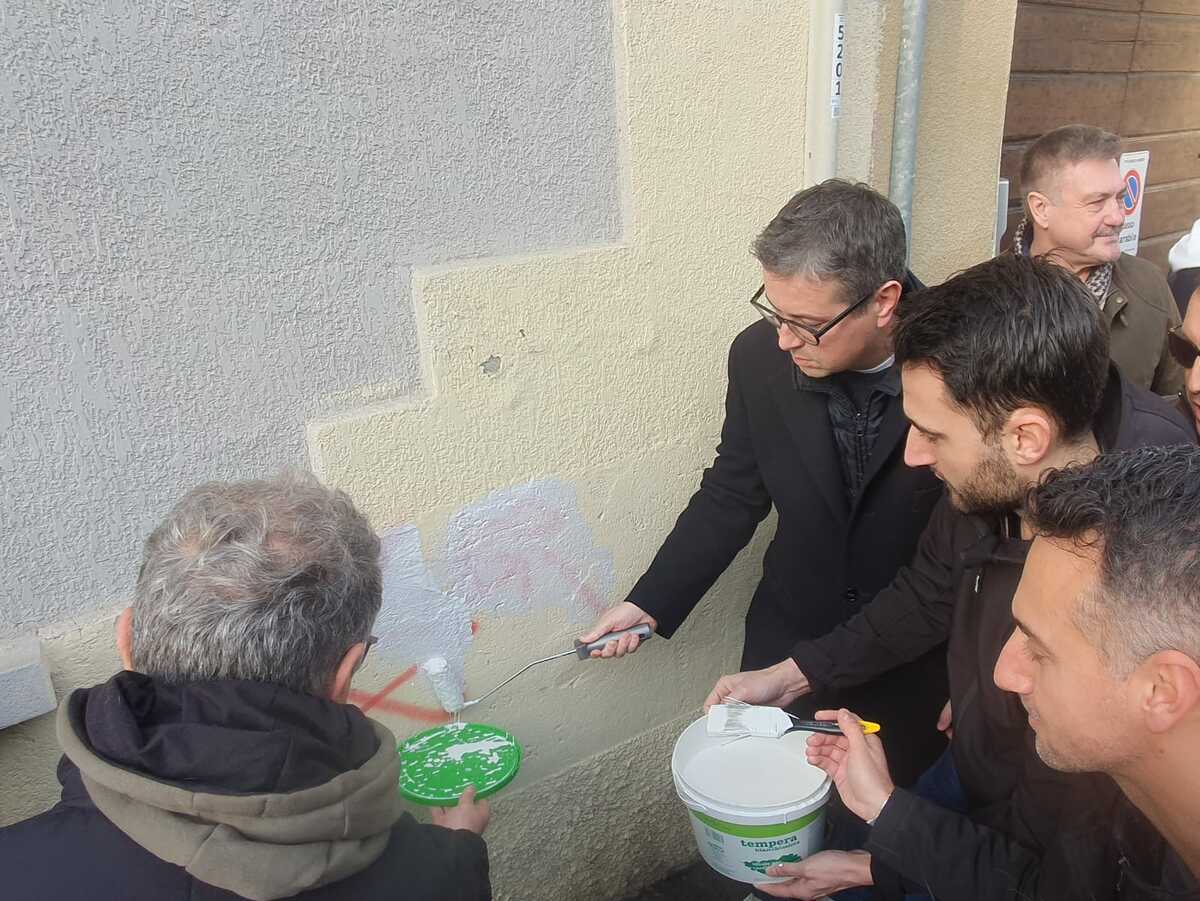 Tanti gli esponenti dei due partiti di centrodestra che questa mattina, domenica 21 dicembre, si sono ritrovati in via Culin per cancellare, con una simbolica staffetta-pennello in mano, le minacce alla presidente del Consiglio: «Spara a Giorgia», con la stella a cinque punte delle Br, le stesse parole con cui, a distanza di qualche giorno, era stato deturpato il muro che separa la sede del Pd di Busto e lo sportello Spi-Cgil.