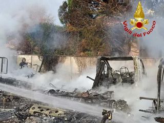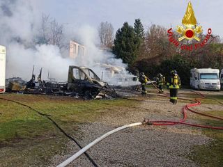 FOTO. Incendio in un camping, quattro camper e una roulotte distrutti dalle fiamme