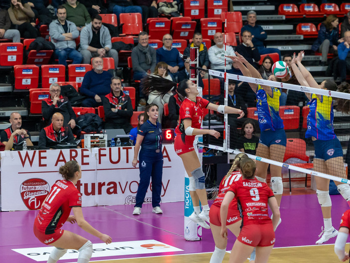 Seconda sconfitta consecutiva per la Futura Volley Giovani, che davanti al proprio pubblico non riesce a fare il regalo di Natale sperato e anzi, incassa un netto 3-0 per mano della Cda Talmassons. Al di là dei meriti della formazione friulana, al decimo successo consecutivo e in semifinale in Coppa Italia, la squadra di coach Mauro Tettamanti gioca una gara non all’altezza delle ultime uscite valse la grande risalita fino al quarto posto e dopo il match di Offanengo mostra ancora i segni di una stanchezza forse più mentale che fisica. La Cda fa la voce grossa in tutti i fondamentali, mettendo in difficoltà le biancorosse con una battuta tatticamente incisiva, un attacco efficace anche senza la ex Alyssa Enneking (MVP del match è Efrosyni Bakodimou con 15 punti ma in doppia cifra vanno anche Islam Gannar, Giorgia Frosini e Beatrice Molinaro) e un muro che sbarra a ripetizione la strada alle attaccanti di casa (14 block totali, 4 per Gannar, 3 per Molinaro). Nessuna delle Cocche raggiunge la doppia cifra: una generosissima Sofia Rebora si ferma a 9 punti con 2 muri, in ricezione non basta Sophie Blasi (60% di positiva). A parziale consolazione resta il quarto posto con il distacco immutato nei confronti di Altino, a -3 visto il k.o. contro Fasano. Si allontana Altafratte, ora a +9 e prossima avversaria della Futura.