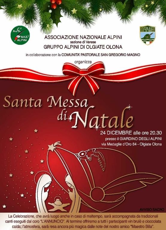 Come sempre, ad accompagnare la funzione celebrata dal cappellano del gruppo don Edoardo Mauri, saranno i tradizionali canti eseguiti dal coro "L'annuncio" e le note del "Maestro Billa"; al termine della messa, poi, ci si potrà scaldare con vin brulè e cioccolata offerti dal gruppo Alpini Olgiate Olona.