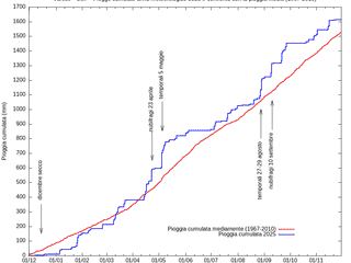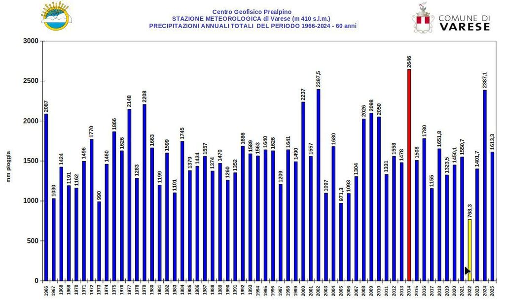 La pioggia cumulata nel corso dell’anno a Varese è stata 1613 mm, solo del 4% superiore alla media. In provincia la precipitazione è variata