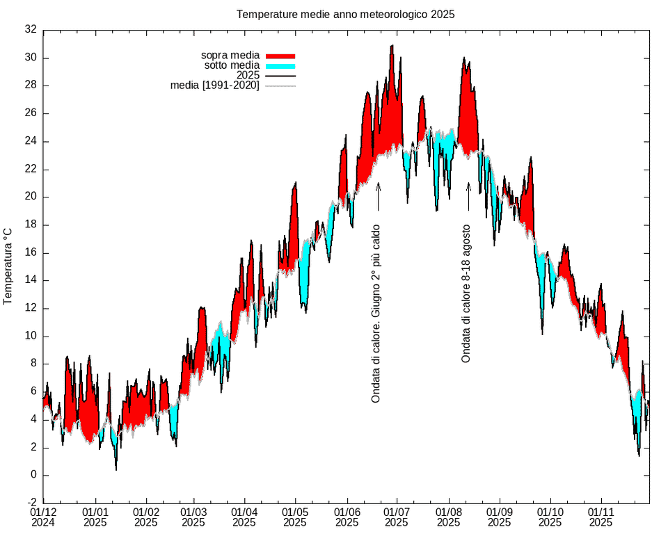 Tuttavia tutti i mesi hanno fatto registrare temperature oltre la norma 1991-2020, ad eccezione di maggio e luglio che sono stati 0.3°C più freschi. I giorni di gelo sono stati solo 13, valore più basso dal 1967. Ci sono state due ondate di calore estive, la prima si è verificata
