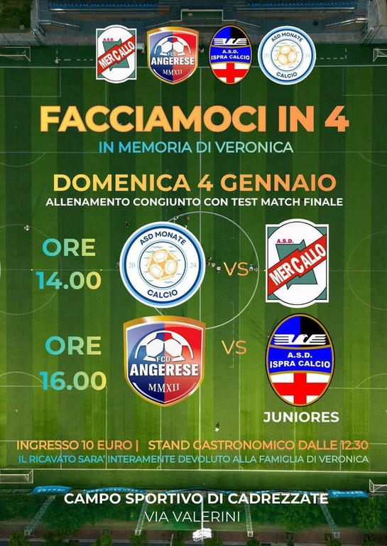 Domenica 4 gennaio al campo sportivo di Cadrezzate con Osmate, con inizio alle ore 14 ma con stand gastronomico attivo già dalle 12.30, si terrà il torneo "Facciamoci in quattro" che vedrà protagoniste in un quadrangolare le squadre di Monate, Angera, Ispra e Mercallo.