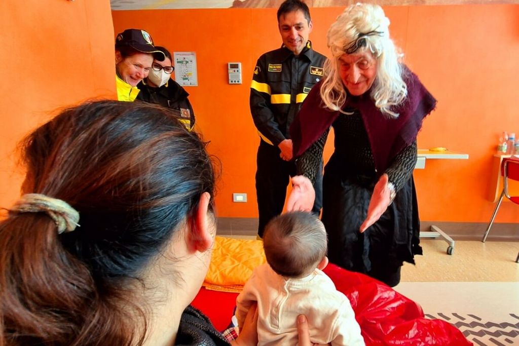Disperata non sapeva più che cosa fare. Fortunatamente sono giunti in suo aiuto i Vigili del Fuoco, che, attirati dai suoi lamenti mentre erano nelle vicinanze, in men che non si dica, capitanati dal loro Comandante ingegner Ciro Bolognese hanno attivato l’autoscala e l’hanno portata su fino in sala giochi». Il Ponte del Sorriso racconta così la tradizionale visita della vecchina nei reparti pediatrici dell'Asst Sette Laghi e non solo.