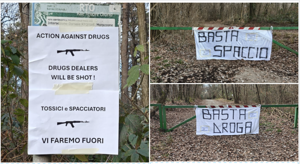 Frasi e striscioni dai contenuti minatori che arrivano da una zona, come tante altre purtroppo della nostra provincia e non solo, spesso teatro di spaccio nei boschi. Un fenomeno, quello dei pusher attivi nei nostri boschi, che nel Varesotto continua nonostante l'incessante lavoro di polizia e carabinieri, che quotidianamente svolgono retate smantellando bivacchi, sequestrando sostanza stupefacente, fermando o mettendo in fuga gli spacciatori e segnalando i clienti (leggi QUI l'ultima operazione in provincia pochi giorni fa).
