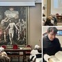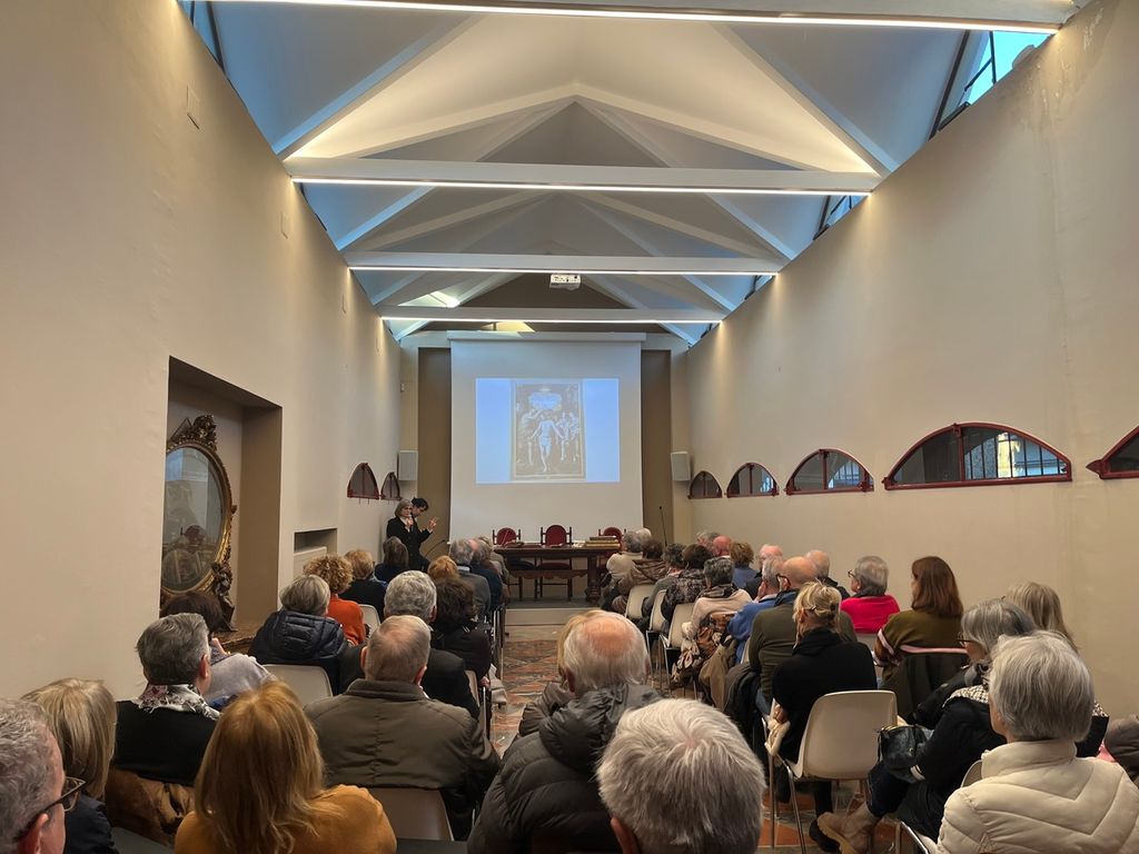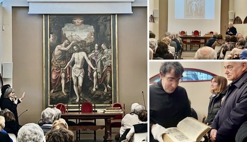 Il ponte con l'arte è offerto dalla splendida opera esposta nella sala della Biblioteca Capitolare. Si vede sullo schermo, all'inizio dell'intervento della professoressa Elena Angeleri, ma poi ecco che questo si solleva e il quadro compare. «Un olio su tavola - spiega la docente - di 2,62 per 1,82 e come si vede nel cartiglio c'è la firma di Bernardino con la data 1554». L'autore affermato, influenzato da Gaudenzio, ha terminato l'opera a Vercelli, poi questa sarà trasportata a Milano per essere incorniciata. Ma si scoprono anche altri tesori da approfondire, compresa una Bibbia stampata a Venezia nel Settecento che ha come incisore una monaca, suor Isabella (prima, Elisabetta) Piccini.