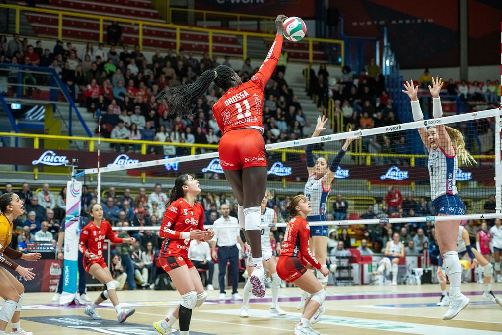 Solo nel terzo set la UYBA è riuscita davvero ad accendere l’Arena. Spinta dalle bordate di Obossa, miglior realizzatrice delle padrone di casa con 14 punti, la squadra biancorossa ha trovato ritmo e coraggio, arrivando a condurre fino al 17-14 e dando l’illusione di poter riaprire il match. Per qualche minuto il pubblico ha rivissuto quelle sensazioni di battaglia che rendono speciale la e-work Arena.