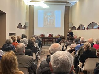 Il ponte con l'arte è offerto dalla splendida opera esposta nella sala della Biblioteca Capitolare. Si vede sullo schermo, all'inizio dell'intervento della professoressa Elena Angeleri, ma poi ecco che questo si solleva e il quadro compare. «Un olio su tavola - spiega la docente - di 2,62 per 1,82 e come si vede nel cartiglio c'è la firma di Bernardino con la data 1554». L'autore affermato, influenzato da Gaudenzio, ha terminato l'opera a Vercelli, poi questa sarà trasportata a Milano per essere incorniciata. Ma si scoprono anche altri tesori da approfondire, compresa una Bibbia stampata a Venezia nel Settecento che ha come incisore una monaca, suor Isabella (prima, Elisabetta) Piccini.