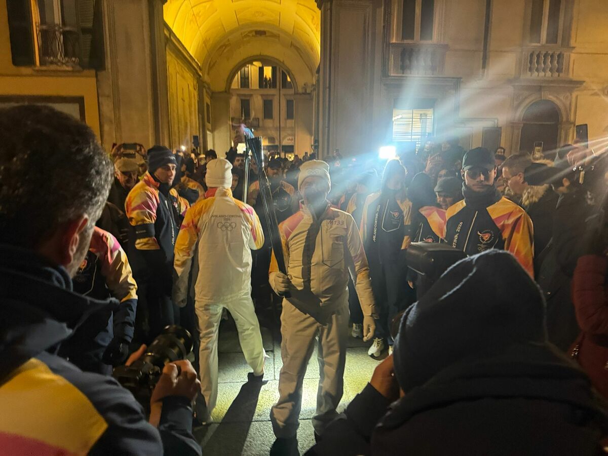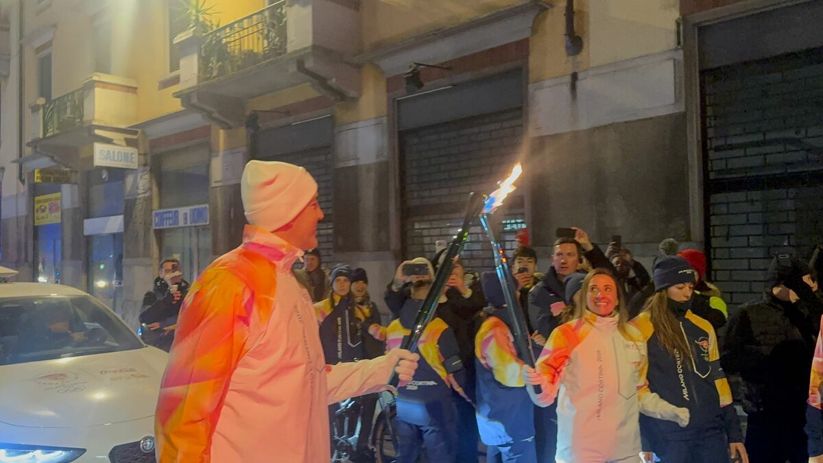 19.51 - Piazza Monte Grappa: il tedoforo Meneghin accolto da due ali di folla