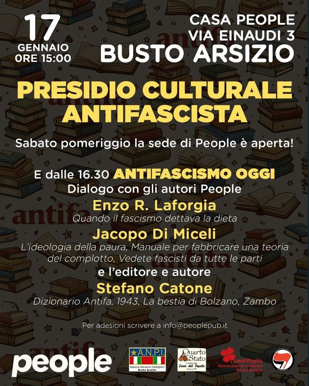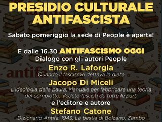L’appuntamento, intitolato “Presidio culturale antifascista”, è in via Einaudi 3, a partire dalle 15, per «discutere liberamente e visitare la nostra redazione – spiegano i promotori – e, dalle 16.30, per confrontarvi con due nostri autori: Enzo Laforgia (autore di Quando il fascismo dettava la dieta) e Jacopo Di Miceli (autore di Vedete fascisti da tutte le parti. Già)». In programma anche l’intervento dell’editore e autore Stefano Catone.