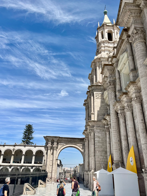 Ma è solo avvicinandosi al centro che la città rivela la sua vera natura.La pietra chiara del “Sillar” domina lo sguardo. Riflette la luce con una forza quasi abbagliante, disegna volumi netti, contorni precisi. È da qui che nasce il soprannome di “Ciudad Blanca”, ma ridurre Arequipa a una questione cromatica sarebbe un errore. Il bianco non è solo estetica. Questa è una città costruita ai piedi dei vulcani, su una terra instabile, e lo ricorda in ogni dettaglio. Nulla è leggero, nulla è solo bello. Nel centro storico, tutto cambia passo. Il rumore si attenua, le strade si fanno più ordinate, come se il luogo imponesse spontaneamente una disciplina. Nella Plaza de Armas, ogni dettaglio trova una misura. I porticati, le arcate, la facciata della Catedral: sono elementi al posto giusto, senza ostentazione. Di sera, l’ambiente si trasforma. Le luci calde scolpiscono la pietra, l’acqua delle fontane riflette le torri come se volesse trattenerle. Arequipa non cerca l’effetto immediato. Si lascia scoprire attraverso i dettagli: i portali barocchi consumati dal tempo, le finestre incorniciate da secoli di sole, i bassorilievi che raccontano una fede concreta.