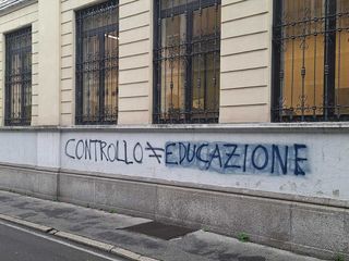 Passo molto spesso davanti al Liceo Crespi, e vedo, sul muro da mesi 2 scritte, che mi destavano curiosità “CONTROLLO DIVERSO DA EDUCAZIONE” e “FUORI GLI SBIRRI DALLE SCUOLE”.