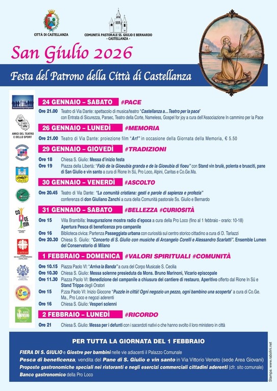 I festeggiamenti di San Giulio inizieranno ufficialmente sabato 24 gennaio, con lo spettacolo di musica e teatro “Castellanza a…Teatro per la pace”, che si terrà alle 21 all’interno del Teatro di via Dante, per poi proseguire sino al 2 febbraio con un’alternanza di momenti laici e religiosi che culmineranno, come da tradizione, nella giornata di domenica 1 febbraio, quando il centro cittadino ospiterà le immancabili bancarelle e la benedizione del campanile sancirà ufficialmente la fine dei lavori di restauro.