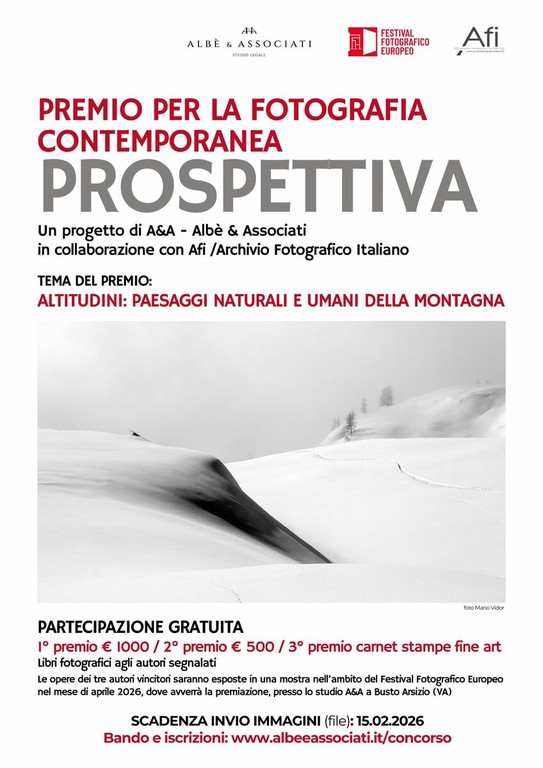 A&A – Albè & Associati, da sempre impegnato nella promozione della cultura e della ricerca artistica, annuncia la prima edizione di “PROSPETTIVA – Premio per la fotografia contemporanea”, realizzato in collaborazione con Archivio Fotografico Italiano (AFI) e inserito nel programma della XIV edizione del Festival Fotografico Europeo.