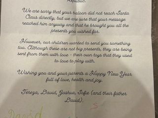 Nella lettera che accompagnava il pacco, arrivato a Villa Cortese il 14 gennaio dopo essere stato rintracciato tramite facebook, Tereza ha scritto parole toccanti: «Anche se non sono grandi regali, sono spediti con amore: sono i loro giochi con cui amavano giocare». Un passaggio di testimone tra infanzie europee, suggellato da una foto inviata dalla Repubblica Ceca che ritraeva i bambini nel bosco il giorno di Natale, intenti a portare cibo agli animali selvatici.