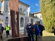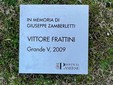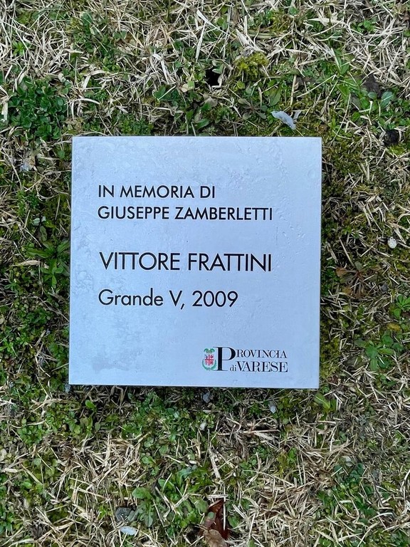 L’artista Frattini, insieme al presidente Magrini e al prefetto Pasquariello, ha svelato la targa affissa alla scultura riportante la dicitura In memoria di Giuseppe Zamberletti - Vittore Frattini - Grande V, 2009.