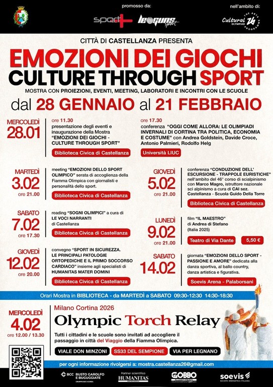 Momento simbolico dell’iniziativa sarà il passaggio della Fiamma Olimpica di Milano Cortina 2026, previsto a Castellanza mercoledì 4 febbraio, tra le 12 e le 13.30, coinvolgendo cittadini, scuole, associazioni e realtà sportive.