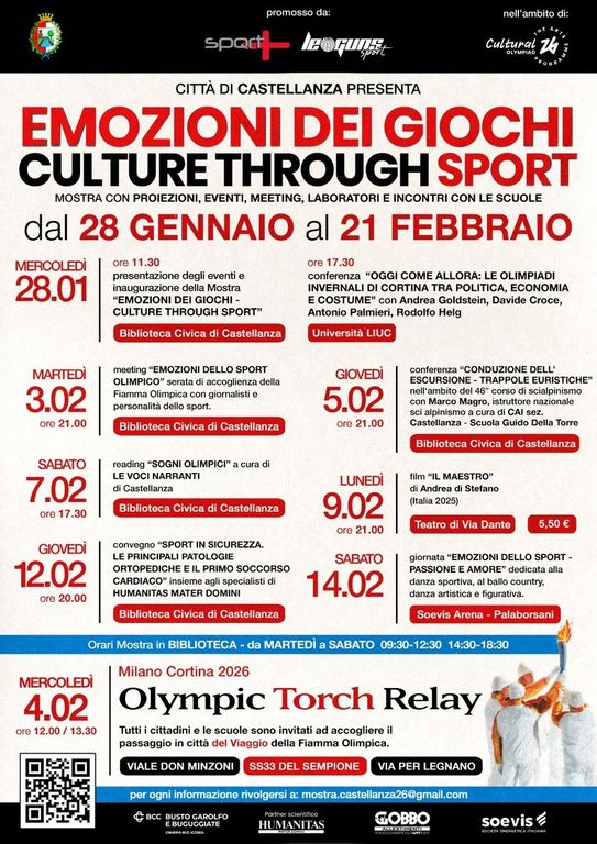 È stata inaugurata mercoledì 28 gennaio alla Biblioteca Civica di Castellanza la mostra «Emozioni dei Giochi – Culture Through Sport», inserita nel palinsesto ufficiale dell’Olimpiade culturale di Milano Cortina 2026. L’esposizione, realizzata dalla FICTS (Fédération Internationale Cinéma Télévision Sportifs), propone un percorso tra immagini e audiovisivi strutturato attorno a tre grandi temi: le emozioni dei Giochi Olimpici estivi e invernali, le Donne ai Giochi e le storie dei Giochi Paralimpici.