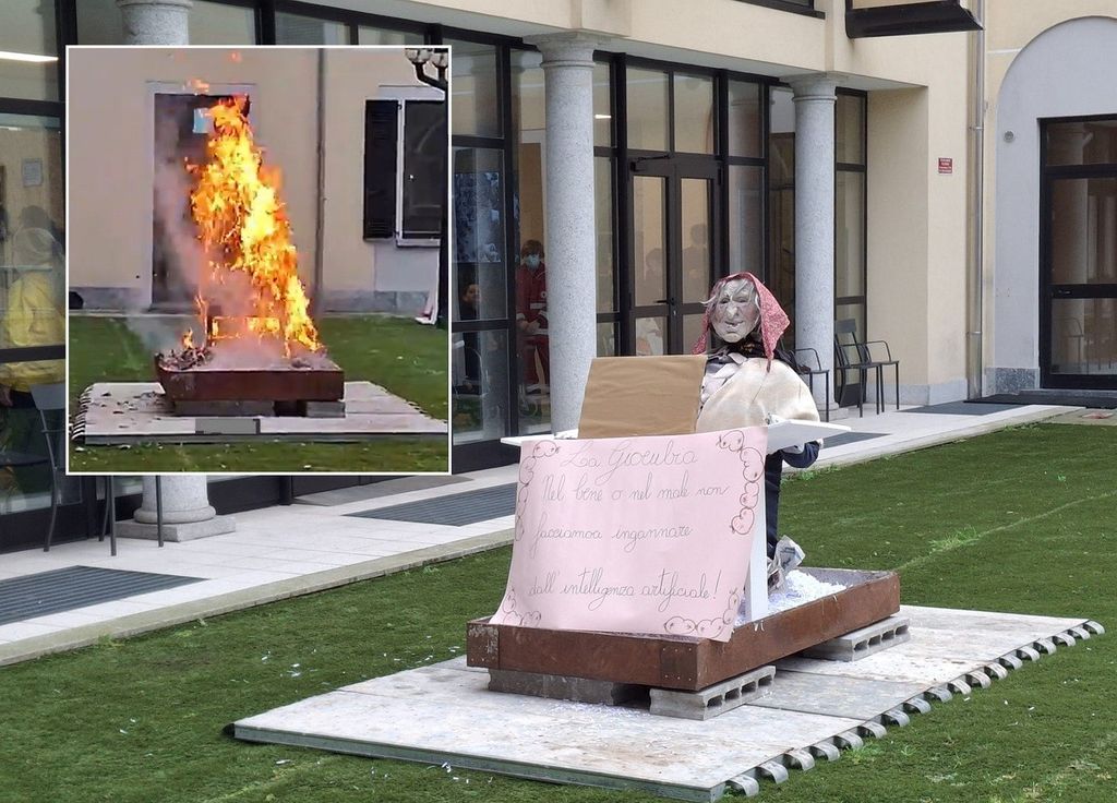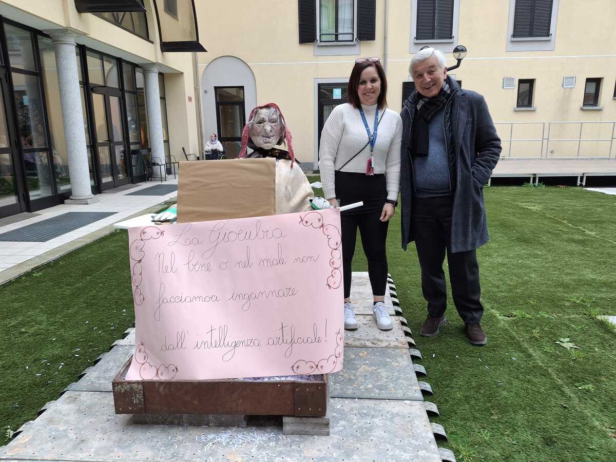 Prima dei fantocci esposti in piazza Santa Maria e destinati al rogo di via Einaudi alle 19 (vedi QUI), ha preso fuoco quello della Provvidenza. Poco dopo le 15.30, il presidente Luigi Chierichetti ha impugnato una torcia e appiccato le fiamme a una giöbia intenta a “smanettare” su un pc. “Nel bene o nel male, non facciamoci ingannare dall’intelligenza artificiale”: questo il messaggio associato all’allestimento. L’idea, si spiega dalla realtà di accoglienza e cura, è scongiurare il pericolo che certi strumenti prendano il sopravvento sulle persone, invece che essere di supporto e aiuto.
